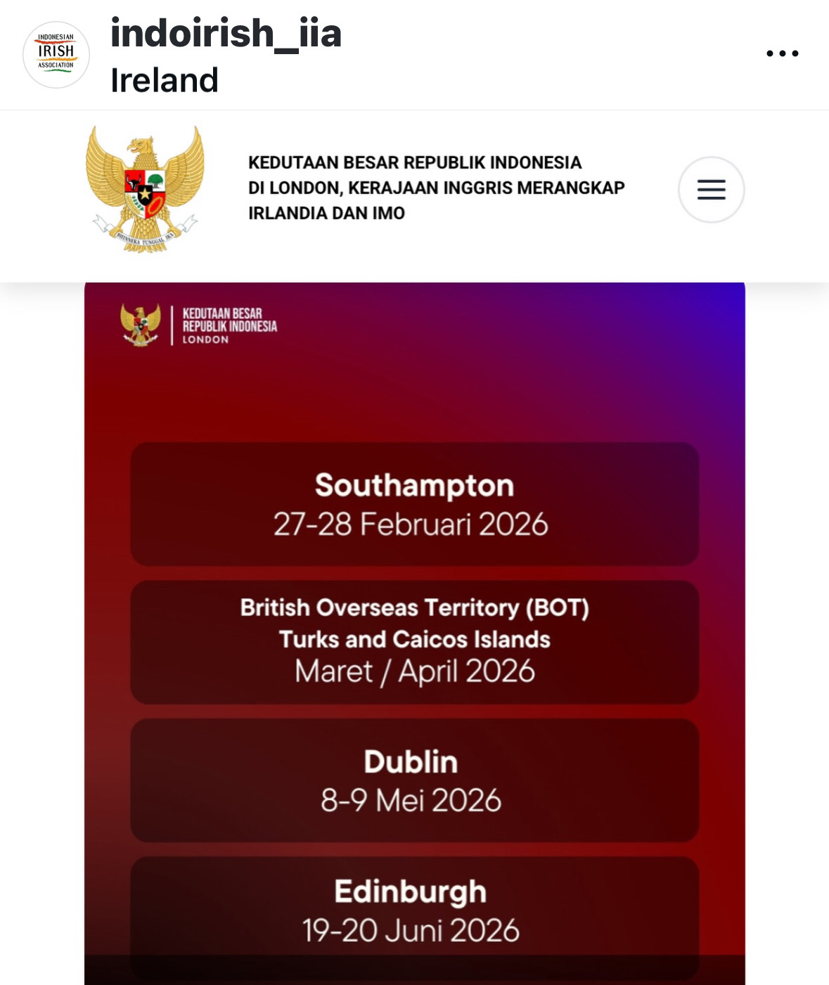 Jadwal Konsuler Dublin 8-9 May 2026. Tempat akan diberitahukan secepatnya.