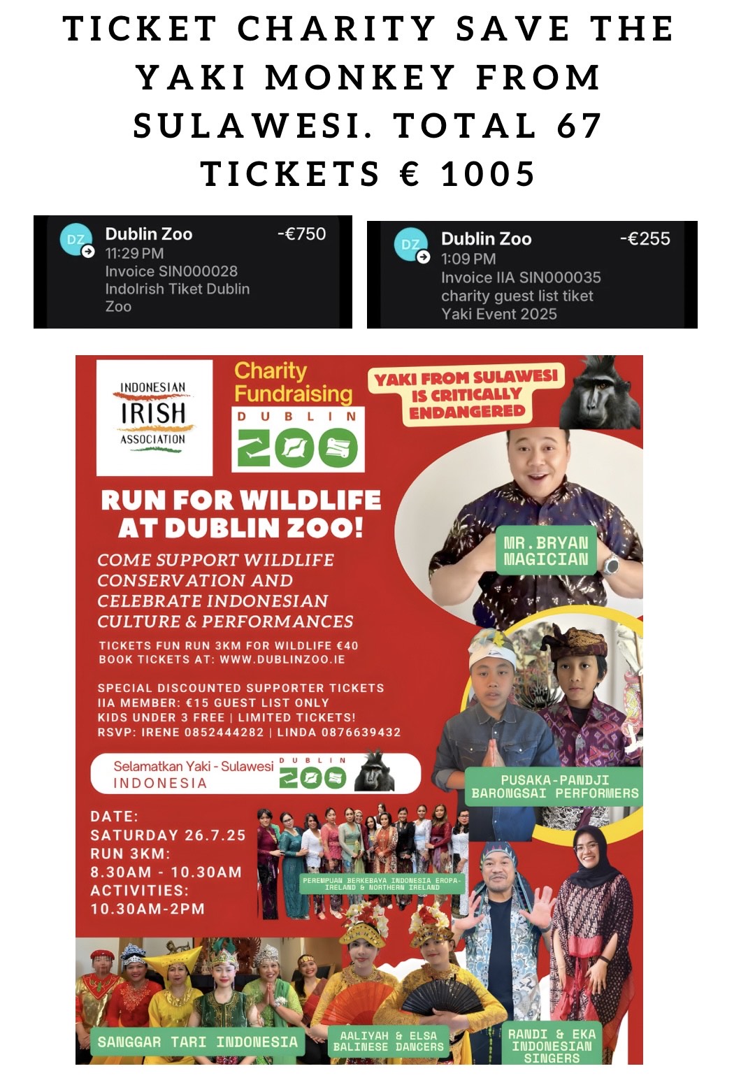 Terima kasih kepada semua yang telah membeli tiket charity Event Save the Yaki Monkey Dublin Zoo 26.7.2025 dan mendukung acara ini. Semoga setiap amal dan kebaikan Bapak/Ibu/Saudara/Saudari semua dilipat gandakan oleh Tuhan Yang Maha Esa Allah SWT. Amien Ya Robbal Alamin.